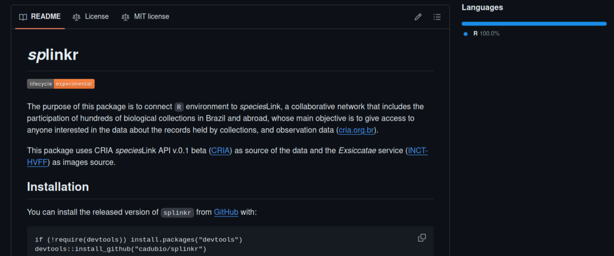 Um pacote do R (https://www.r-project.org/) que o acesso aos dados de coleções biológicas.